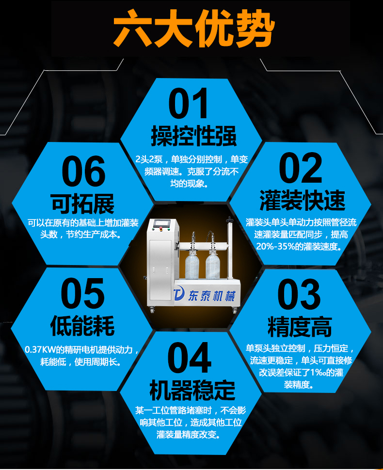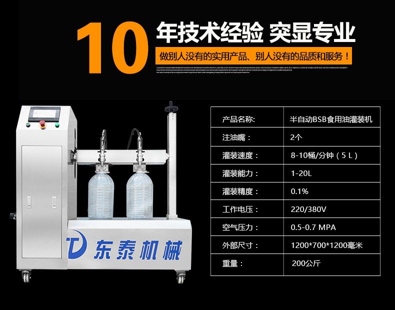 本機(jī)適用于花生油、大豆油、菜籽油、色拉油、芝麻油、石油化工潤(rùn)滑油等各種油類和粘稠液體的定量要求。半自動(dòng)雙頭電動(dòng)BSB食用油灌裝機(jī):采用的微電腦技術(shù),自備動(dòng)力,管路無(wú)需加壓,節(jié)約運(yùn)行成本;自動(dòng)檢測(cè)油浙、自動(dòng)修正溫度變化引起的密度變化,適合大溫差環(huán)境的油品灌裝工作,使用方便靈活;機(jī)電一體化設(shè)計(jì),安裝方便,整機(jī)價(jià)格低廉。